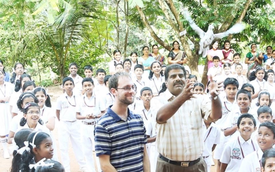 In Kerala State, in South India, Young Leaders Program Coordinator Matthew Youde (left) watches as Karickam International Public Schools teacher Rajukutty K O Karikom releases a peace dove